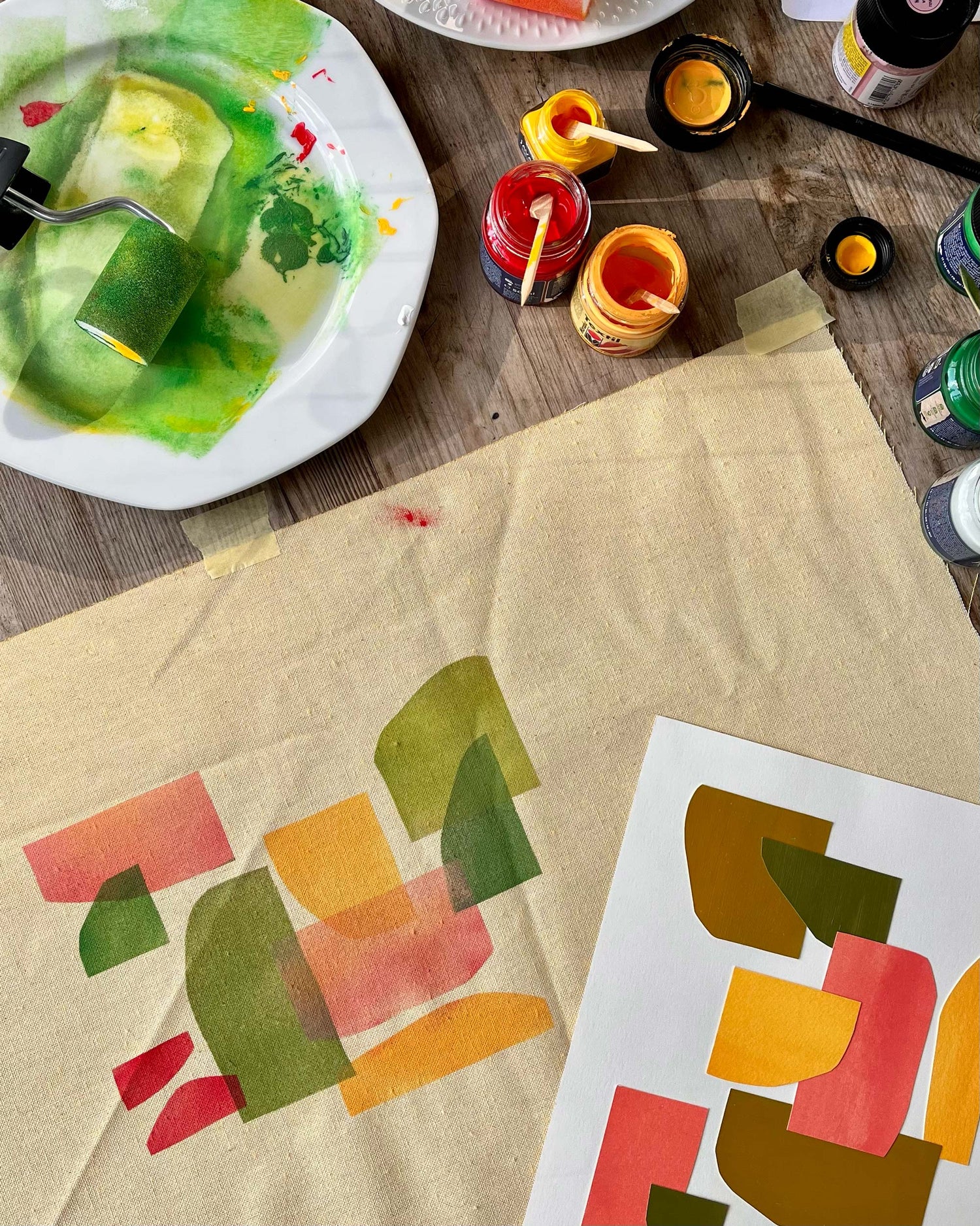 Hier dreht sich alles um das Bemalen und Bedrucken von Textilien. Wir entwickeln Schablonen oder Stempel aus Moosgummi und Radiergummis, entwerfen Motive und bilden Rapporte. Dann wird gedruckt: auf Stoffe, T-Shirts, Socken, Pullover oder Beutel.
