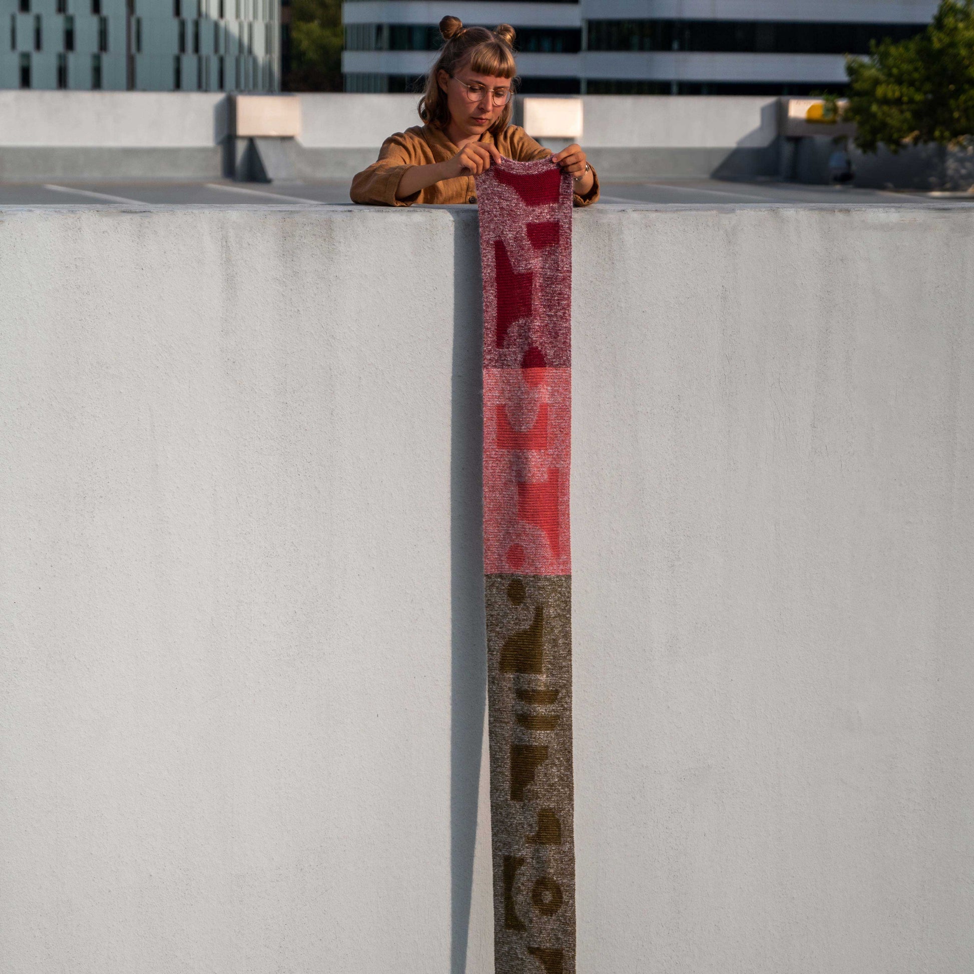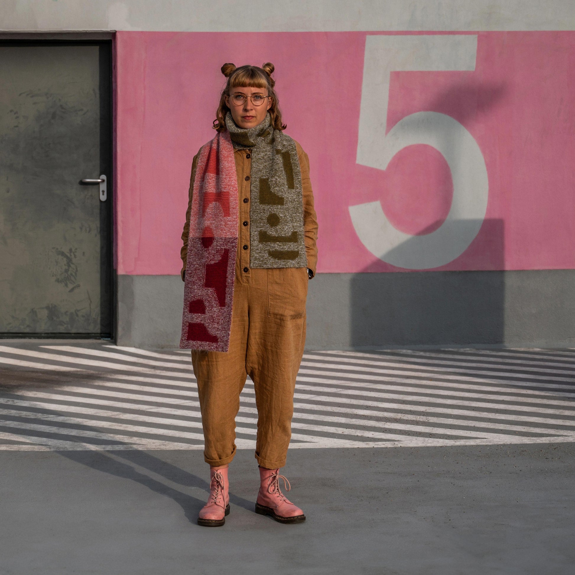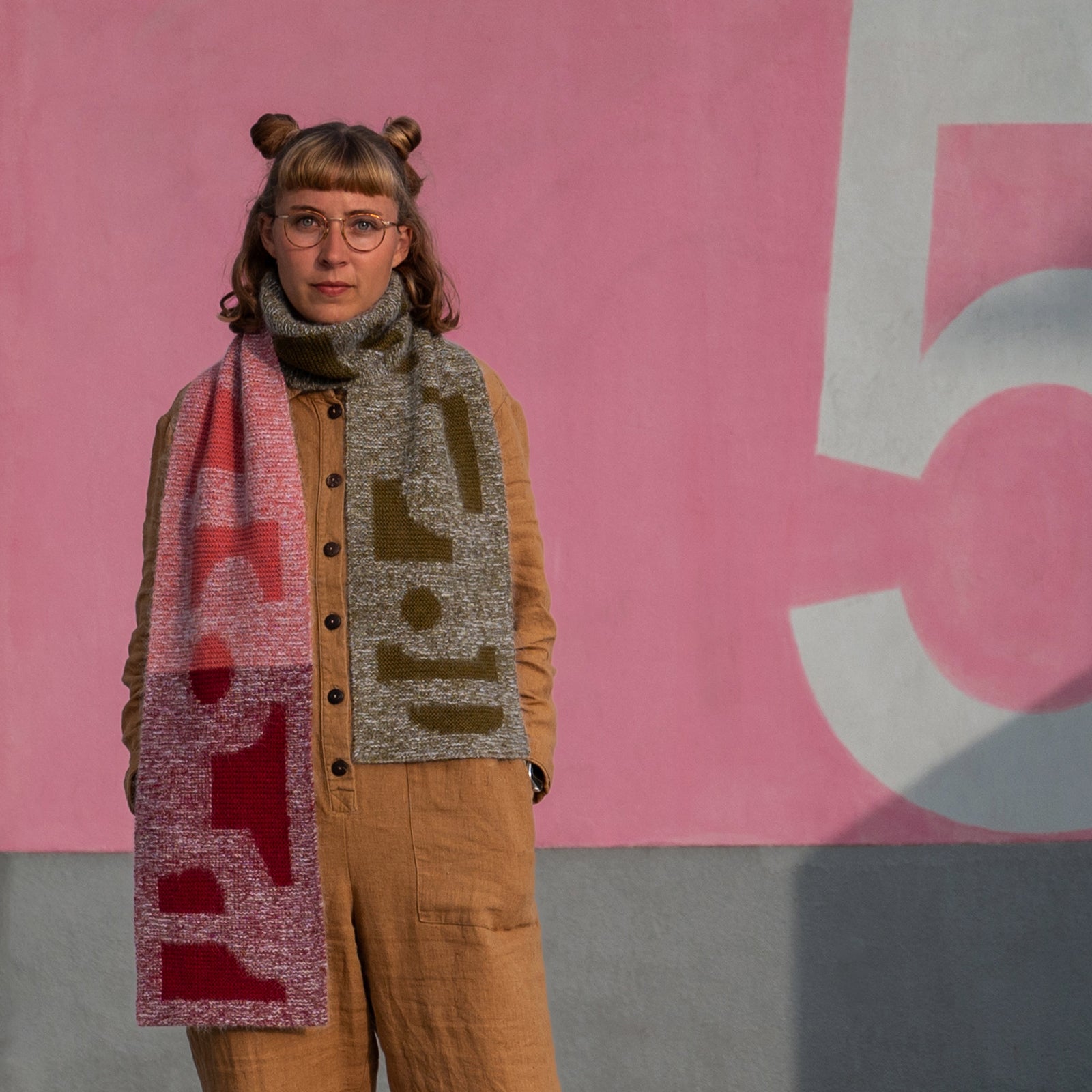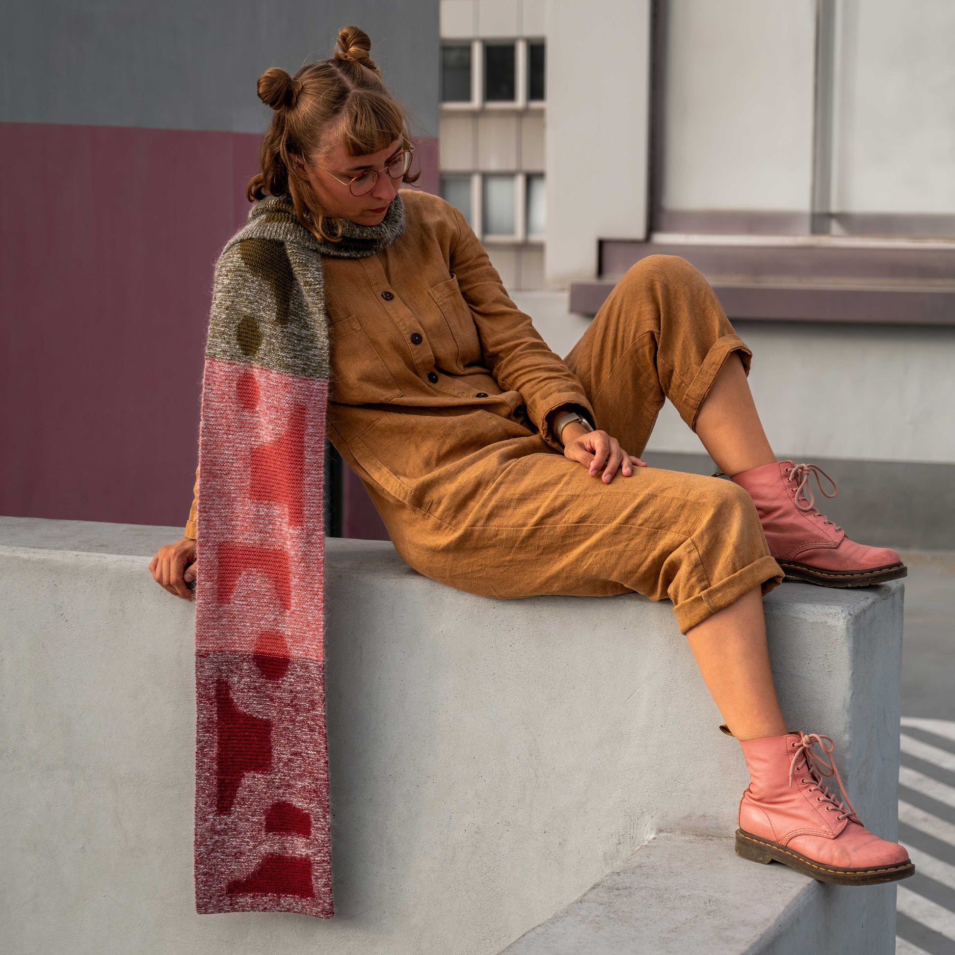 The Snip Scarf is knitted in garter stitch, creating lots of graphical shapes by knitting a variation of the intarsia technique which is similar to marling. It is knitted with one continuous strand of base yarn held together partly with a strand of lightweight mohair or alpaca blend.